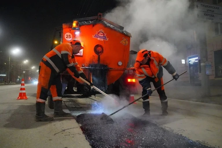 Ночью, когда трафик минимален, подрядчики заливают выбоины горячим составом.